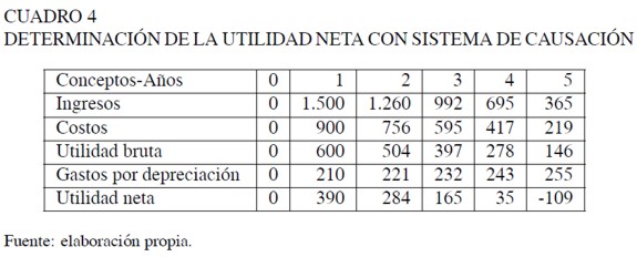 En el Cuadro 4 se muestra la determinación de las utilidades netas del proyecto siguiendo un sistema de causación, en el que las erogaciones por la inversión inicial se sustituyen por gastos de depreciación imputados durante la vida útil de los activos. Las utilidades netas calculadas mediante los sistemas de causación exhiben un perfil distinto, en el que los primeros períodos no presentan resultados negativos.