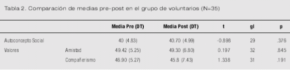 Con respecto a los adolescentes voluntarios, para analizar si se produjeron cambios en su autoconcepto prosocial como consecuencia de la experiencia de voluntariado, se realizó la prueba t-Student para muestras relacionadas entre las medias obtenidas antes y después de la intervención. En este caso no se encontraron cambios significativos en esta variable en el grupo voluntario. Tampoco se encontraron cambios significativos en las puntuaciones obtenidas en la prueba de valores de amistad y valores de compañerismo (Tabla 2 ).