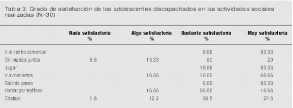 En cuanto a la evaluación del grado de satisfacción, prácticamente todos los adolescentes discapacitados participantes señalaron que las actividades sociales realizadas habían sido muy satisfactorias, siendo aún más placenteras las que habían supuesto un contacto cara a cara más personalizado, tales como ir al Centro Comercial (el 93.33% así lo afirmó), salir de paseo (93.33%), jugar (83.33%), ir a conciertos (66.66%). Asimismo, oír música juntos (60%), hablar por teléfono (66.66%) o chatear (58.5%), les resultaron actividades bastante placenteras (Tabla 3 ).