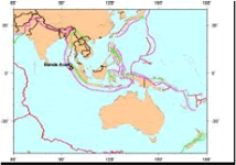 Figura 3. Límites tectónicos en la zona epicentral del terremoto del 26 de diciembre. Las zonas de subducción están representadas en púrpura, las zonas de rift en rojo y las fallas de transformación en verde. Figura tomada de USGS (2005).