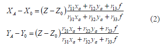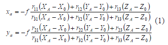 Where (x, y) are image co-ordinates of target points, f, the principal distance; (X, Y, Z) are object space co-ordinates of target points; (X0, Y0, Z0) are object space co-ordinates of the projection centre; rij are the components of the rotation matrix R, which is a function of the three rotation angles ω, κ, φ that define the spatial rotation between the object space system to the image co-ordinate system.