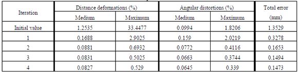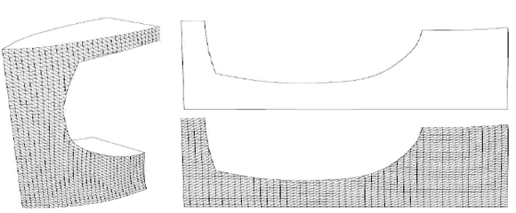 The application generates a CAD neutral file with the shape of the cutting profile that is needed for the machining processes of the metal sheets (see figure 4). The mathematics of this method is based on the solution of an optimization problem that takes into account the isometric development of the isoparametric curves with geodesic curvature preservation. The surface is first approximated with a triangular mesh. Distance deformations and angular distortions are measured between each pair of mesh nodes and each pair of crossing isoparametric curves at the nodes respectively, are observed as a result of the mesh flattening process. An optimization procedure is applied to a function based on the value of these deformations. Table 3 shows the evolution of these values in successive iterations, where the values of distance deformations and angular distortions are expressed as a percentage of the actual distances and angles. The medium and the maximum values are computed each iteration.