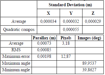 The 3D surfaces modeling was obtained with 74 restituted points (including the projected grid of dots). The bundle adjustment provide the results show in the table 2, for all points (including the grid of dots) used to generate the 3D model. This table shows information about: standard deviation of the cloud of points (average values in X, Y, Z axes and quadratic composition of the averages); the mean quadratic error, the mean error and the maximum error observed in the parallax (m); Root Mean Square (RMS) error and maximum residual error (pixels); angle maximum and minimum between images (deg).