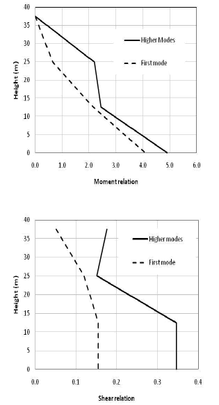 The demands for each mode depend on the modal form, mass and period according to the acceleration spectrum. The coefficients for the corresponding shears and moments are shown in Figure 2. To obtain the values it is necessary to multiply these coefficients by the building total weight, W=m*g and by the pseudo-acceleration Sa.