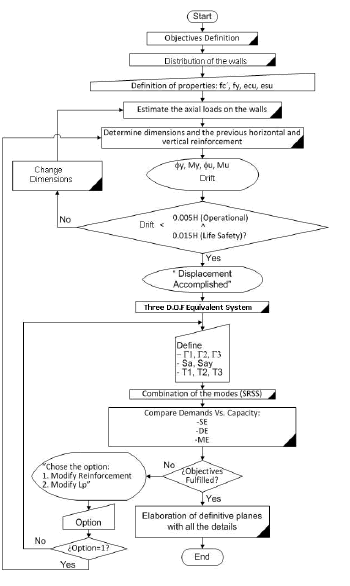The proposed method supposes an initial geometry of the transverse section of the wall, using the following criteria: a) the height-to-length ratio (H/Lw) in each direction must be lesss than or equal to 4.0, b) the storey height-to-wall width (hn/bw) must be less than or equal to 25 and, c) and the relative compression stress must be less tan 0.2, in order to guarantee that is possible to obtain a displacement ductility greater than 3. Thus, the fulfillment of the performance objectives can be attained.