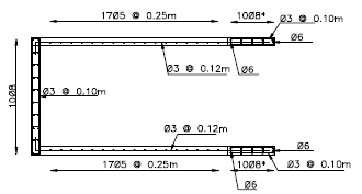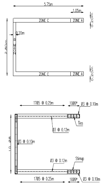 The method begins from supposing 1% and 0.3% of longitudinal and transversal reinforcement ratios, respectively. The confining effect on the stress-strain relationships of the concrete is considered, but it is only taken into account to increase the ultimate compression strain. The increase in the compression strength is not considered because it can cause spalling of the unconfined concrete reducing the original section. Figure 5 shows the geometry and final reinforcement array of the wall 1.