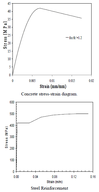The concrete nominal compressive strength is 35 MPa and the nominal yield strength of the steel is 420 MPa. The concrete and steel stress-strain relationships are shown in Figure 6.