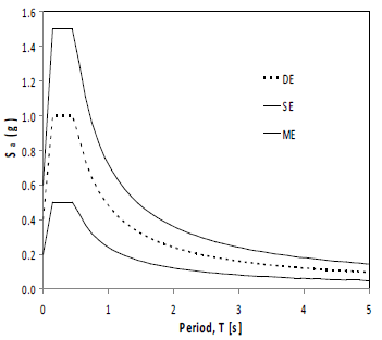 The Design Earthquake, DE, corresponds to the one defined by the UBC-97 for a soil type SB, a seismic source type B, a nearby field, with a seismic acceleration and velocity coefficient Ca and Cv equal to 0.4. For the SE and ME earthquake levels, the design spectrum was factored by 0.5 and 1.5 respectively (See Figure 7).