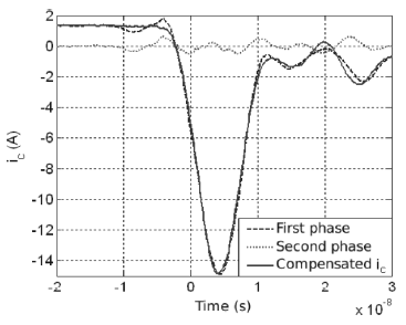 Synchronous noise disturbs the signal for every repetition in the same way [15], which means that the measured signal is composed of signal plus the synchronous noise. So the compensation technique to reduce the measurement error is applying the double measurement method [16], which consists of a) the first phase: the measurement of signal+noise (+unbalances), and b) the second phase: the measurement of noise (+unbalances). The measurement of noise consists of locating the probe in the same position without measuring the signal of interest. Figure 4 shows the compensation technique of ic obtained by applying this method. In order to compensate for the primary variables, the noise in the second phase has to be correctly measured. For measuring the noise of the voltage, the probe has to be referred to the ground. For measuring the noise of the current, the probe has to be located in the same place under currentless conditions.