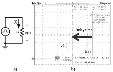 The delay time (Δt) can be characterized by applying a square signal to a purely resistive load, see Figure 5a. The delay time can be obtained from the measured voltage and current waveforms, as is shown in Figure 5b. The technique used to compensate for the delay time consists in introducing a phase shift (Δt), as is shown in (3).