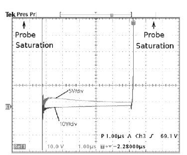 Figure 8 shows the error produced by an unbalanced voltage probe or saturation of the oscilloscope input channels. This is caused when a high voltage difference, around 400V applied to the probe, takes place in the commutation of the device, from blocking state (Vdsoff) to conduction state (Vdson). Consequentely, a strong saturation is produced in the oscilloscope input channels. The technique used to compensate for this problem is to limit the measured voltage seen by the probe. Figure 9 shows the circuit proposed for measuring low voltage during device conduction and the results of V6 are shown in Figure 10. The drain-source voltage Vdson is deduced from equation (5).