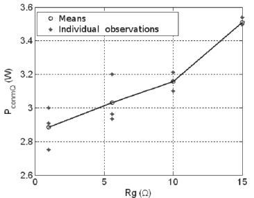 - Treatment or levels. This is the set of values for the factor to evaluate. Here, the following set of values for Rg is considered: 1 Ω, 5.6 Ω, 10 Ω, and 15 Ω.