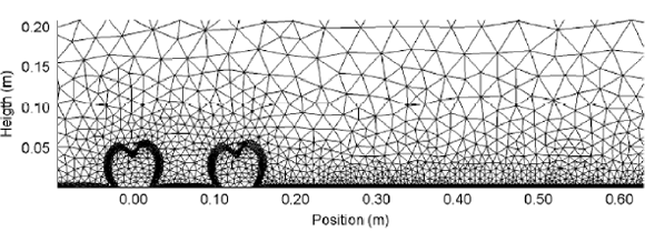 The numerical solution consists of two major steps: discretization of the solution domains and of the equations. The first step was carried out by means of a multi-purpose unstructured triangular mesh generator in two-dimensions. This mesh generator was implemented using the Delaunay triangulation technique 13; and an unstructured triangular mesh was generated for the calculation domain, as shown in Figure 2.