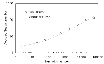 Computational simulations were performed and the Nusselt numbers were compared to those predicted using the Whitaker correlation. The Nusselt number was calculated according to its definition (i.e. the normal dimensionless temperature gradient at the wall) as:
