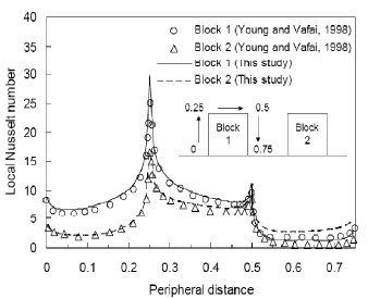 In order to evaluate the performance of a conjugate problem, a second validation study was performed for fluid flow in a rectangular channel with two mounted heated blocks. These blocks are heated by a constant heat flux at their lower surfaces. A comparison of the local Nusselt number obtained in this study with those reported by reference 12 is presented in Figure 4.