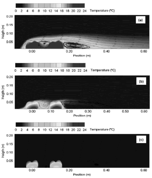 Computational fluid dynamics and computer modeling have been used to study problems in the agricultural and food industries 1, 3, 4, 5. Conjugate heat transfer and fluid flow in a channel containing heated elements has been studied for several decades, using both numerical and experimental methods 6, 7, 8, 9. Although such problems were mainly focused on the cooling of electronic components, some post-harvest processing techniques utilize the same problem configuration. The conjugate heat transfer problem for laminar flow over an array of three heated obstacles was solved using a control volume formulation by 10. The reference 11 used a similar correlation to study the same problem, but with experimental data instead of numerical simulations. Young and Vafai [12] also studied the cooling process of heated blocks, mainly discussing the conjugate behavior of the heat transfer process.