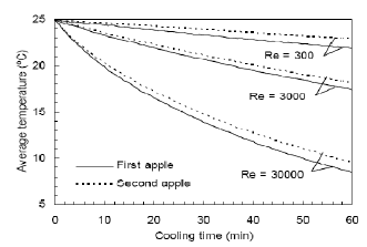 The average temperatures for the apples are presented in Figure 6 and the fact that the differences in average temperature for the individual apples increased with time and with the Reynolds number can be verified.
