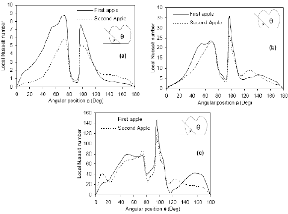 The local Nusselt numbers are presented in Figure 7 for Re = 300, Re = 3000 and Re = 30000 as a function of angular position. Near-stagnant flow at the top surface of each apple (90º) is observed for all Reynolds numbers. A cavity exists at this position and the low air velocity leads to a stagnant flow, so the Nusselt number decreases significantly for both apples. The convective heat transfer (i.e. Nusselt number) is more intensive in the upper left portion of the apples (70º and 100º) where both thermal and velocity boundary layers are thinnest. At the lower front and rear portions of each apple, the Nusselt was minimal. It can also be observed that the difference in the local Nusselt number for the apples decreases as the Reynolds number increases due to the growing velocity of the recirculation zone.