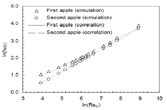 The Reynolds number is based on the apple diameter. Simulation simulations were performed for and the global Nusselt number was calculated for each apple. The global Nusselt number as a function of the Reynolds number is presented in Figure 8. The global Nusselt number correlations for the first and the second apple were respectively evaluated as: