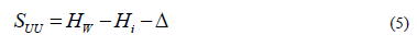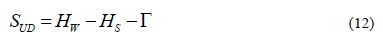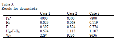 The values of Hs and Hi are obtained from equations (3) and (10), indicated in the cells of the 2nd row. The values of D and G are obtained from equations (4) and (11). The results are presented in the 3rd. row. The "useful stroke" during the upstroke is obtained from expression (5) and during the downward stroke from equation (12) given in row 4. The converted energy in the upstroke, WU, is obtained from the above results, according to equation (6) and during the downward stroke, WD, according to equation (13). The results of both expressed in J/m2 are given in the 5th row. Assuming a known period introduced as input data in seconds, the accumulated energy can be obtained per unit time, as the ratio of the former to the period. The result, expressed in watts, is given in the first row of Table 4.