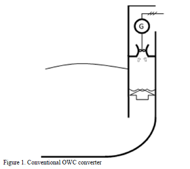 At present, over 1000 Wave Energy Converters (WEC) are patented worldwide [1]. All Wave Energy Converters (WEC) of the oscillating water column type (OWC), currently in operation or under construction, whether off -shore or on-shore, have a structure that can be represented schematically as shown in Fig. 1. The turbine shaft may be arranged vertically, as in the plant installed in Mutriku (Guipúzcoa, Spain), or horizontally, as in the case of the wave power plant of Pico (in the Azores) or that of the island of Islay in Scotland [2].