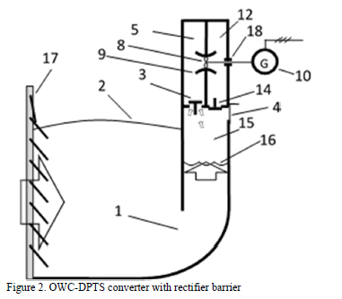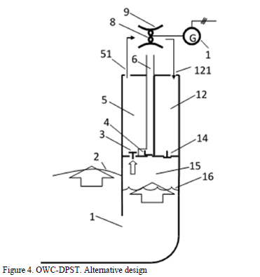 - The proposed OWC-DPST can use unidirectional flow based Francis turbines with their increased performance and efficiency, instead of Wells turbines with their bidirectional flow.