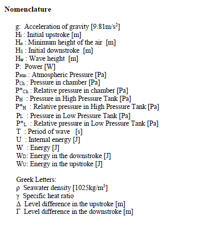 Since g;, g, Patm, and r, can be considered to be constant, a function PH of the wave height HW and the minimum wave height H0, such that maximizes the accumulated energy per cycle can be achieved. For a constant wave height, the value of H0 will vary continuously according to the tide height. The chosen pressure for the high pressure tank, PH, will have a direct effect upon the useful energy.