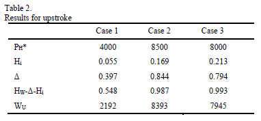 The results presented in Tables 2 and 3 are obtained from the input data shown in Table 1, using the equations derived above, using a spreadsheet. Table 2 shows the upward stroke of the water column in the chamber, and in Table 3 the downstroke.