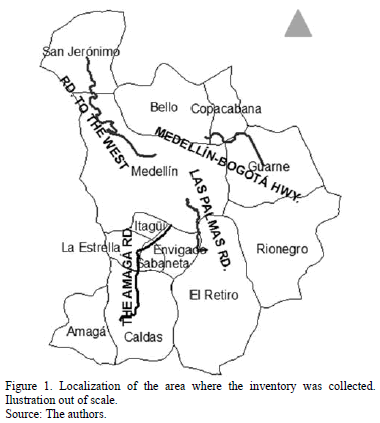 The data was collected in four roads located outside Medellín and nearby hillsides, as shown in. The roads where: (i) The Medellín - Bogotá Highway, northeast of Medellín, connect this city with the capital of the country. The section in which the data was taken goes through the townships of Bello, Copacabana and Guarne. (ii) Road to the West, known as West Tunnel road link, connects Medellín with the Urabá region, where an important maritime terminal is located. The considered sector goes through Medellín and San Jerónimo. (iii) The Amagá road connects Medellín with the municipality of Amagá and the considered sector goes through Itagüí, La Estrella, Sabaneta and Caldas, municipalities located southeast from Medellín. Last, (iv) Las Palmas road, is one of the routes to access the east of Antioquia, where the José María Córdoba airport is located. This section goes through the municipalities of Envigado and part of El Retiro.