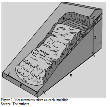 The measurements taken were: Height of the landslide (z), width (y) and depth (x), as shown on Figure 2.