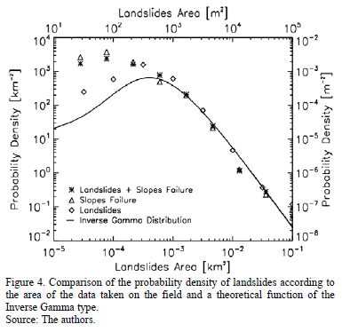 Fig. 2 shows the result obtained when comparing the probability density of the data survey and the theoretical distribution. It is possible then, to appreciate that the data correspondent to all of the landslides, adjust well on the right end of the theoretical curve correspondent to big areas, ergo, for landslides bigger than 5x10-4 km2. In contrast, for landslides with areas smaller than those indicated before, the probability densities are bigger than the theoretical.