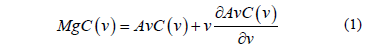 The model proposed is a static analysis of congestion. In Fig. 1, the AvC(v) curve represents the average (or private) costs perceived by drivers and the MgC(v) curve represents the marginal (or social) costs; both costs are related by equation (1), where the second term on the right represents the externalities; i.e., the (marginal) social costs are the (average) private costs plus the externalities.