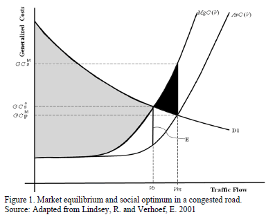 To reach the social optimum it is necessary to charge an amount E (equal to the congestion externality), as the market equilibrium subtracts a social loss (black area) from the social benefit (lightly shaded area). The philosophy underlying the congestion charge policy is to reach an equilibrium corresponding to the social optimum. The policy has been successfully implemented in cities such as London, Singapore, and Stockholm [8]. However, as it is a supply oriented measure which entails charging drivers, it has not yet proven possible to implement it in Latin America (and in developing countries in general), as it is perceived as politically unfeasible [9].