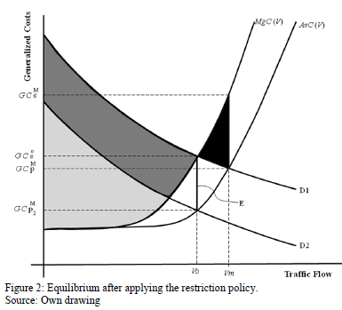 In some cities decision makers have preferred restrictive circulation measures applied to demand. The logic of the implementation is very simple: move the demand curve in order to achieve a new equilibrium with lower costs. As shown in Fig. 2, the license plate restriction measure moves the demand curve to position D2 toward the left of the original curve D1. For our analysis, we shall assume the most favorable of circumstances, in which the movement is such that the new market equilibrium, which corresponds to a private cost GCpM, leads to a flow that is identical to the social optimum, i.e., VO. In other words, we shall assume that there is no need to implement the apparently unfeasible congestion charge in order to achieve flows similar to those that would have been achieved with this optimal policy. However, a more detailed analysis of the measure shows that the effect is not the same. We know that the demand curve reflects consumers' willingness to pay, such that, their inability to use their vehicles generates a social loss; this is represented by the darkly shaded area between curves D1 and D2. We must remember that the equilibrium described relates to the short-term.