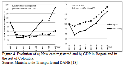 Fig. 4 shows (a) the evolution of new registered automobiles and (b) the evolution of GDP in Bogotá and in the rest of Colombia from 1998 (when Pico y Placa was implemented in Bogotá) to 2005 (when Pico y Placa was also implemented in other important cities like Medellín, Cali and Bucaramanga, involving about 75% of the cars in Colombia). The reference point is 1998, to which we assigned a value of 100 in both cases.