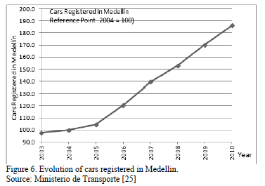 Fig. 6 shows the evolution of registered vehicles in Medellín from 2003 (two years before Pico y Placa was implemented) to 2010; the reference point is 2004, to which we assigned a value of 100 It may be noted that after the implementation of the policy there was an increase in the rate of growth of automobile stock.
