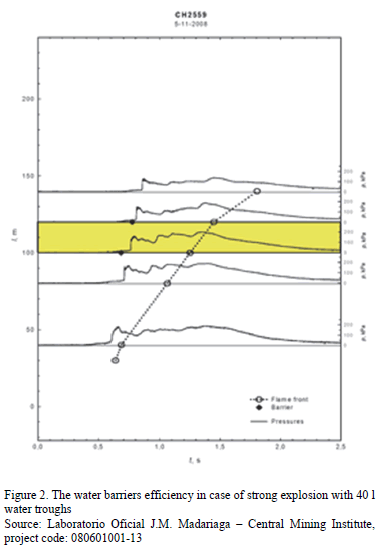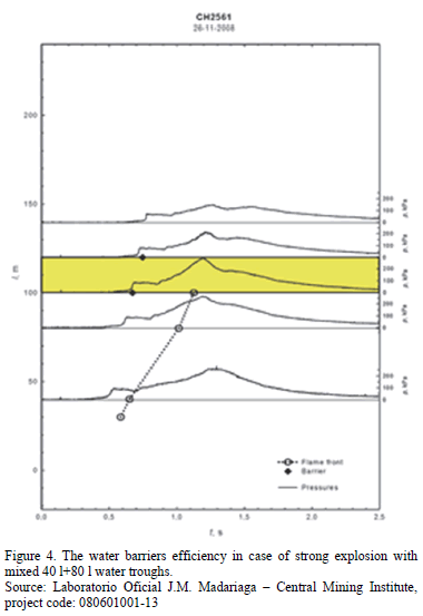 Water barrier arrangement used in test 3, consisting of a mixed distribution of 40 liter and 80 liter trough can be considered as more adequate for the Spanish mines, because more flame traces have been registered by the sensors for the 40 l distribution water troughs than for the mixed distribution of 40 liter l + 80 liter troughs showing that the explosion was contained sooner with the mixed trough distribution