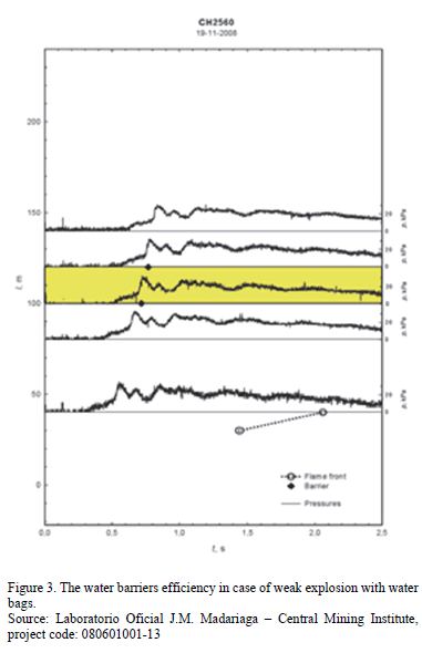 Fig. 2 shows the test record. The Y axis represents distance travelled by the flame front and the X axis represents the needed time; pressure waves are plotted at different distances and the flame front path is drawn by the dotted line. The yellow zone corresponds to the barrier disposition. This figure indicated that the dust explosion was stopped inside the zone of the gallery where coal dust was still present, a little beyond the position of the barrier.