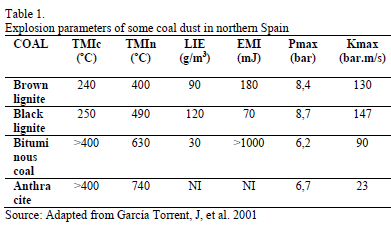 Explosion parameters shown in Table 1 of some Spanish coal dust were determinated by Laboratorio Oficial Madariaga (LOM):
