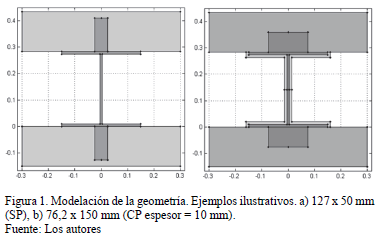 Para la geometría del conector se tomaron en cuenta secciones con valores de alturas de 76,2 mm, 101,6 mm y 127 mm y valores de anchos de 50 mm, 100 mm y 150 mm que son representativos de la gama utilizada internacionalmente en la práctica constructiva y que a su vez están presentes en los ensayos de este tipo de conexión a temperatura ambiente [1,2,20]. Los espesores de protección adoptados fueron 10 mm, 25 mm y 40 mm, lo que se considera un rango razonable, según la práctica internacional. La Fig. 1 presenta ejemplos ilustrativos de las geometrías modeladas.