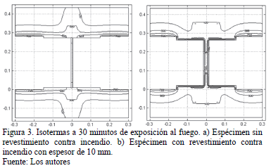 La Fig. 3 muestra las isotermas a 30 minutos de exposición a fuego de especímenes correspondientes a las dos alternativas consideradas, sin revestimiento contra incendio y con revestimiento (de 10 mm de espesor). Se pueden apreciar las diferencias marcadas en el comportamiento térmico de ambos casos.