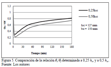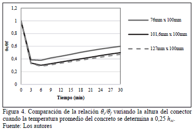 Aunque las mediciones experimentales para determinar la temperatura promedio en el concreto en los ensayos push-out en situación de incendio se realizaron a 0,5 hsc [3] es razonable valorar el comportamiento de la relación qc/qf, cuando la temperatura promedio del concreto se determina a 0,25 hsc. Este nivel se seleccionó tomando en cuenta el mecanismo de fallo del conector tipo canal a temperatura ambiente, y la ocurrencia de altas temperaturas en la región situada en la cara inferior de la losa.