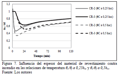 En la Fig. 7 se puede apreciar mediante un ejemplo como influye significativamente el espesor del revestimento contra incendio, en las relaciones de temperatura de dos especímenes, CR-2 y CR-3, con iguales conductividades y características geométricas de la conexión, pero con espesores de revestimiento diferentes, de 10 mm y 40 mm respectivamente.