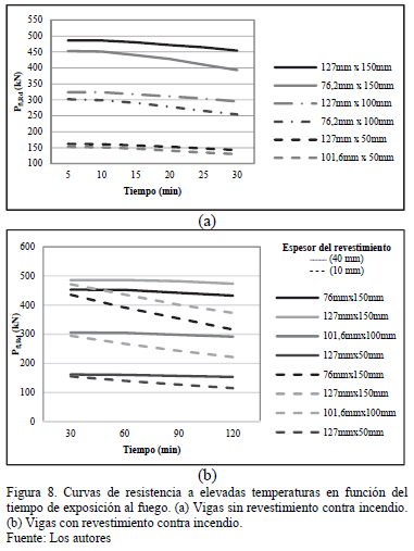 En la Fig. 8 se grafican curvas de resistencia de la conexión a elevadas temperaturas en función del tiempo de exposición al fuego en las que se varía la altura y el ancho del conector para dos variantes: (a) vigas sin revestimiento contra incendio y (b) vigas revestidas, en las que también se varía el espesor de revestimiento.
