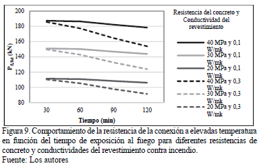 Se puede apreciar que la resistencia del concreto tiene gran influencia en la resistencia de la conexión a elevadas temperaturas, sin embargo, no influye en su decrecimiento en función del tiempo de exposición al fuego.