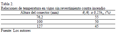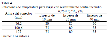 Puede apreciarse que los porcientos propuestos para determinar las temperaturas en el concreto, son mayores que los propuestos en el epígrafe 2.3 para vigas sin revestimiento (ver Tabla 2). Esto se debe a que en las vigas con revestimiento contra incendio, el calentamiento ocurre de forma más lenta, por lo que las temperaturas del concreto de la losa son más cercanas a la temperatura del ala del perfil. No obstante, debe tomarse en cuenta que el impacto de esos valores elevados en el diseño de la conexión se atenúa, debido a que se aplican como factor que multiplica a temperaturas promedios del ala del perfil notablemente inferiores, derivadas de la presencia del revestimiento.