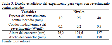 Se realiza el diseño del experimento numérico para estudiar los factores que influyen en las relaciones de temperatura qc/qf, en secciones compuestas con vigas con revestimiento contra incendio (CR). Se mantienen como factores de estudio la altura y el ancho del conector debido a que resultaron representativos para la sección compuesta con vigas sin revestimiento. Se consideran rangos de valores de conductividad y espesor de la protección, representativos de una amplia gama de materiales de revestimiento usualmente empleados en la práctica internacional. Para el diseño estadístico del experimento numérico y el análisis de los resultados, también fue utilizado el programa Statgraphics XV Centurion. Se implementó un diseño factorial multinivel para evaluar el efecto de los factores seleccionados, que arrojó un total de 81 combinaciones. Posteriormente, se realizó la optimización del diseño, utilizando los procedimientos incluidos en el citado programa, con lo que quedaron definidas 16 combinaciones. En la Tabla 3 se muestran las variables estudiadas y sus respectivos niveles.