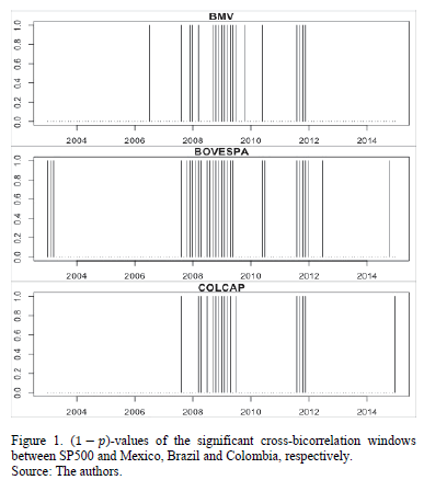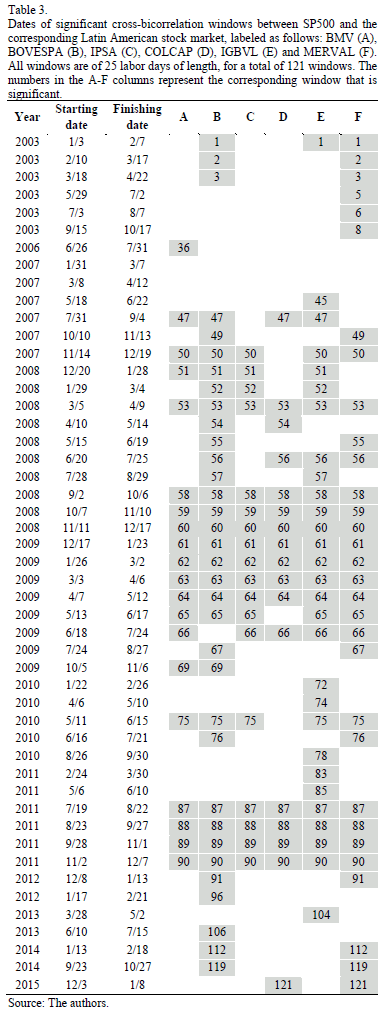 In Table 3 we present the dates of significant cross-bicorrelation windows between the SP500 benchmark and the six Latin American stock market indexes, labeled in the following way: BMV (A), BOVESPA (B), IPSA (C), COLCAP (D), IGBVL (E) and MERVAL (F). All windows are of 25 labor days of length, for a total of 121 windows. During 2003, Brazil and Argentina showed significant cross-bicorrelation windows with the U.S. For the years of 2004 to April 2007, the markets do not co-move, with the exception of a significant window from 6/26 to 7/31 between SP500 and BMV. In the middle of 2007 the effects of the U.S. are visible on some Latin American countries: Mexico, Brazil and Peru are affected earlier than Chile, Colombia and Argentina. However, the effects of the sub-prime financial crisis were felt on all countries from September 2008 lasting till July 2009 (Table 3 (cont.)). From August 2009 to June 2011, there was not much co-movement, Peru being the exception with significant cross-bicorrelation windows during these years. Another block of co-movement was visible from July to December 2011, which might have happened due to the European sovereign debt crisis and some of the concerns over the U.S.'s slow economic growth and its credit rating being downgraded. From 2012 to January 2015, the countries that continued to show significant cross-bicorrelations with the U.S. were Brazil and Argentina.