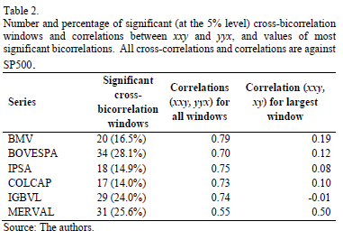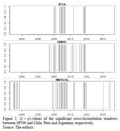 In Table 2, we report the results for the cross-bicorrelation test. All tests are run taking SP500 as the benchmark for comparison, since the effects of the U.S. on Latin America are the ones we wanted to test. We present the number and percentage of significant (at the 5% level) cross-bicorrelation windows, correlation for all windows and the correlation for the largest window. As can be seen, the countries with the most significant cross-bicorrelation windows are Brazil (BOVESPA), Argentina (MERVAL) and Peru (IGBVL), with 28.1%, 25.6% and 24.0% of significant windows, respectively. On the other hand, Colombia (COLCAP), Chile (IPSA) and Mexico (BMV) are the countries with less significant windows (14.0%, 14.9% and 16.5%, respectively). As for the correlations for all windows, most countries present a correlation between 0.70 and 0.79, with the exception of Argentina (0.55). Furthermore, the country with an episode of largest correlation (0.50) was Argentina, whereas the one with the lowest correlation for a single episode was Peru (-0.01). These results shed light on the degree of dependence and co-movement between economies.