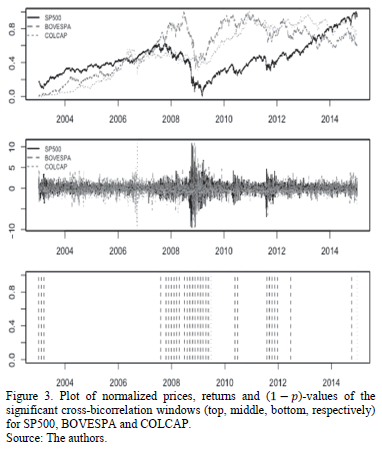 In Fig. 3 we plot the normalized prices for the SP500, BOVESPA and COLCAP indexes. The SP500 is the benchmark and it is compared with BOVESPA that presents the most significant cross-bicorrelation windows (28.1%) and COLCAP that presents the least significant percentage of windows (14.0%). We also plot the returns and the (